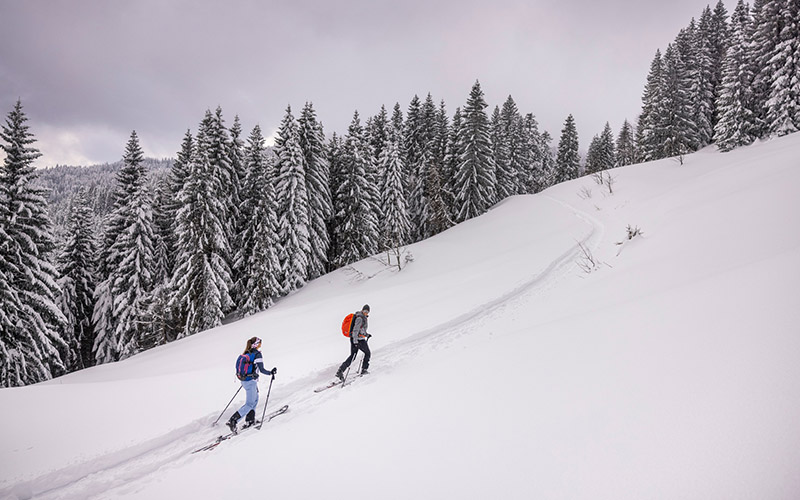 In der Fuschlseeregion führen ausgesuchte Skirouten zur Loibersbacher Höhe in Faistenau oder zur Anzenberghöhe bei Hintersee. Der Tourenlehrpfad Salzkammergut verbindet dabei Theorie mit Praxis: Auf mehreren Schautafeln lernen Tourengeher Lawinenkunde, LVS-Handhabung und sicheres Verhalten im Gelände – ideal für Einsteiger, die verantwortungsvoll in die Welt der Skitouren einsteigen wollen. Mehr Details & Tourenvorschläge finden Sie auf der Skitouren-Seite der Fuschlseeregion.
